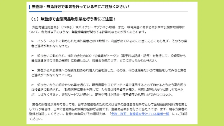 登録が無い業者は「無登録業者」と呼ばれ、金融庁も“利用は危険”と注意を呼び掛けていました。
