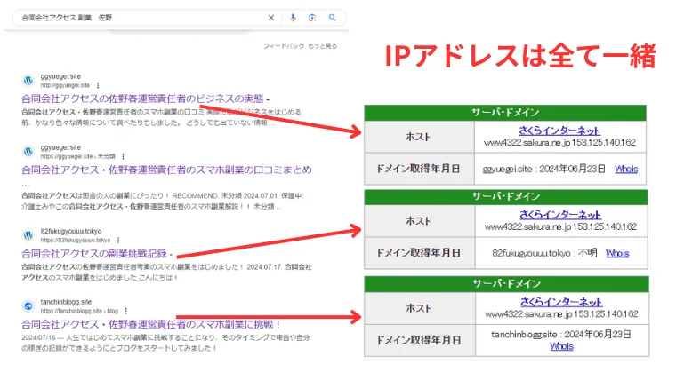 IPアドレスが一致=同じサーバーで管理されているため、ブログの作成者は同一人物と分かります。