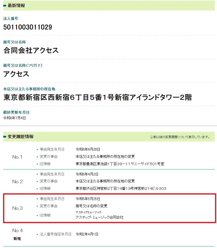 確かに会社は実在しているようですが、以前は「アステップミュージック合同会社」という称号で活動していた過去が判明。