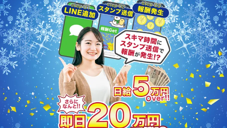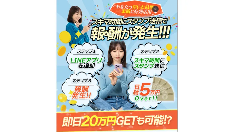 “スキマ時間にスタンプ送信で報酬が発生”と告知しており、即日20万円GETも可能と謳っていました。