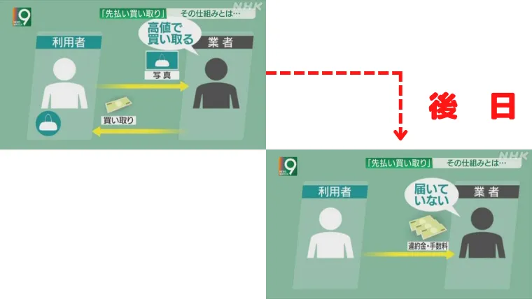 先払い買い取りの被害に遭う人が続出しているので、警察が摘発するのも時間の問題かも知れませんね!