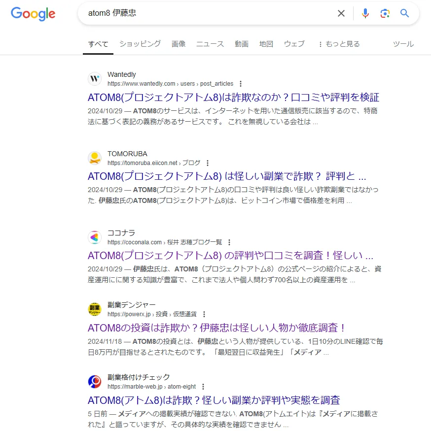 ATOM8の口コミを調べても出てくる評判は最悪レベルで、「詐欺」「怪しい」「要注意」などと批判的な声ばかりです…。