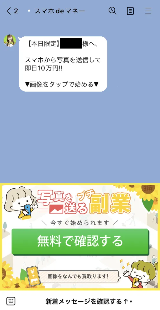 するといきなり「スマホから写真を送信して即日10万円」といかにも怪しいオファーが届きました。