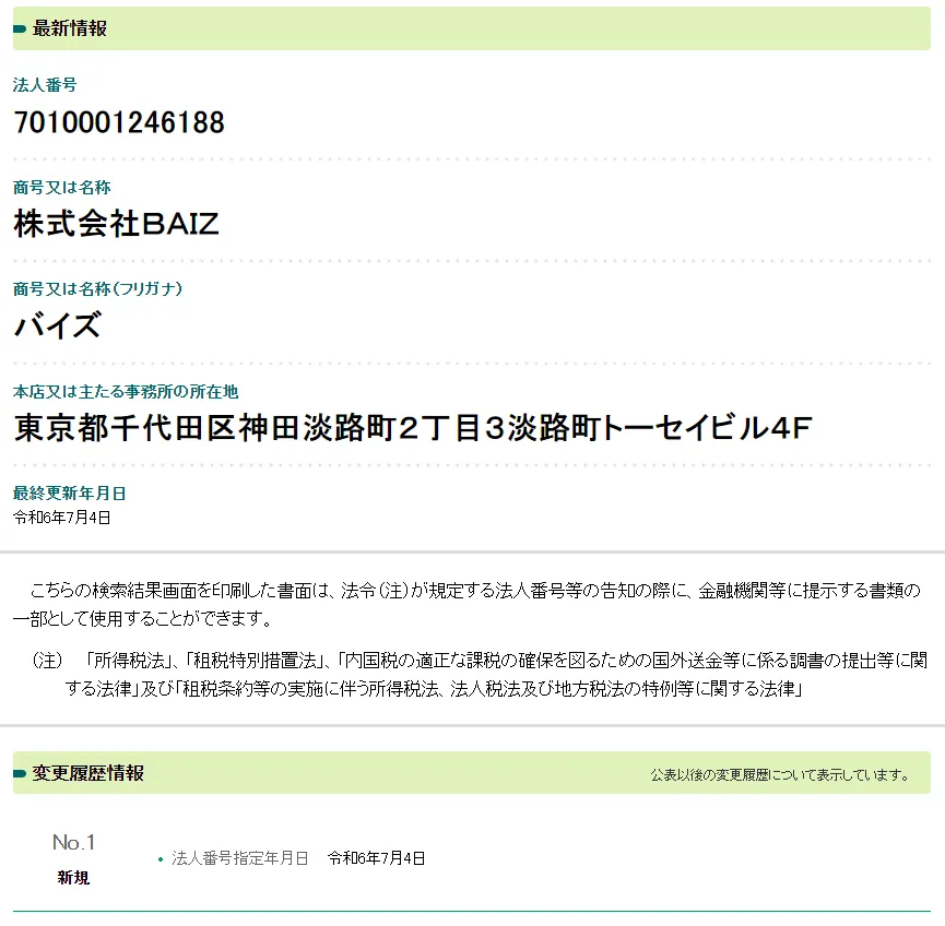 国税庁が運営する「法人番号公表サイト」で、株式会社BAIZの実在は確認できました。