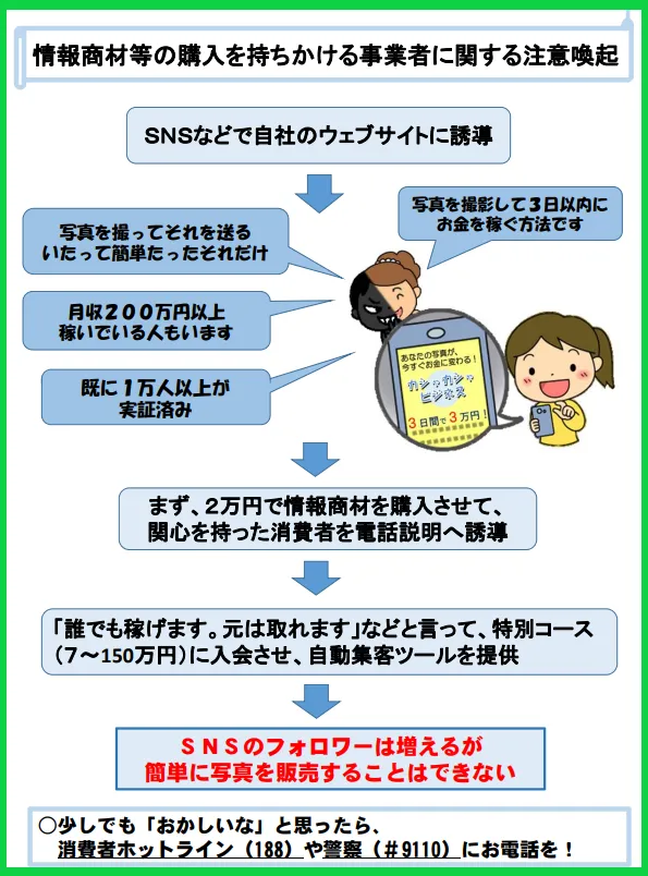 「あなたの写真が、今すぐお金に変わる!」等とうたい、消費者に情報商材等の購入を持ちかけ、多額の金銭を支払わせる事業者に関する注意喚起
