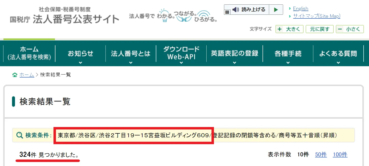 さらに、同じ号室に“324件”の法人が登記されていました。