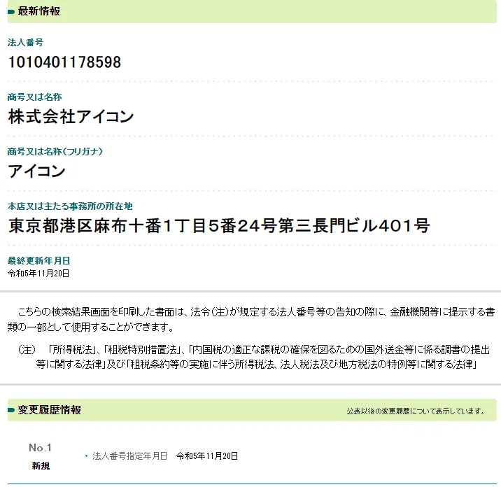 国税庁の法人番号公表サイトで、株式会社アイコンの実在は確認できました。