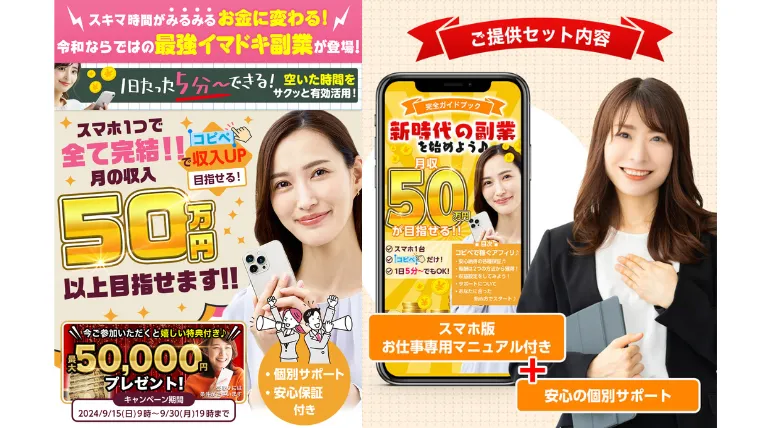特徴をまとめると、1日5分~のコピペ作業で月収50万円が目指せる副業サイトです。