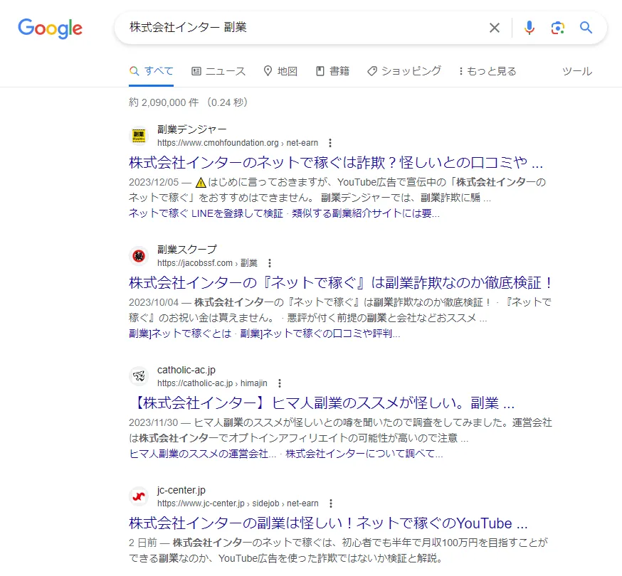上記は、Google検索で「株式会社インター 副業」を調べた結果です。