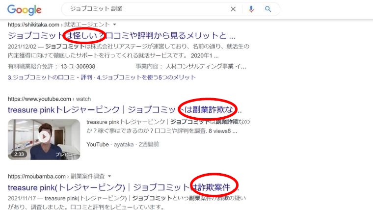 また「ジョブコミット 副業」で検索をした結果は「詐欺案件」や「怪しい」などの評判が多数表示されます。