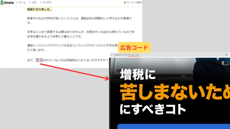最終的に登録へ誘導される流れになっており、登録用リンクには「広告コード」が付与されていました。