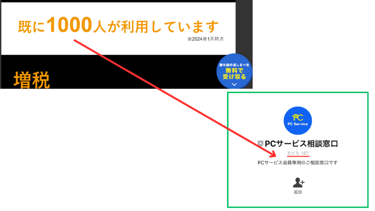 リリースから僅か1ヵ月程度で本当に1,000人の利用者がいるのか、信憑性を確認するためPCサービスの公式LINEを追加しました。