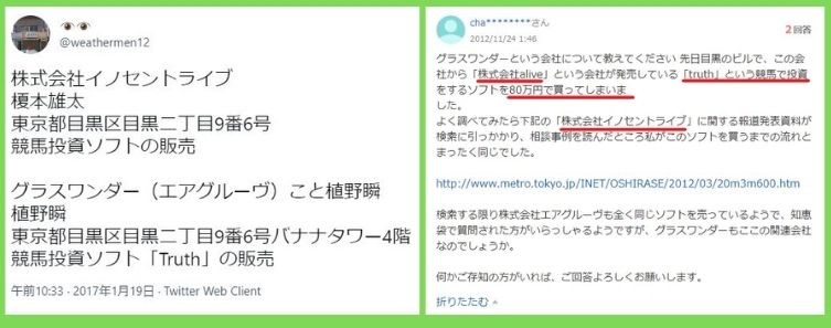 Yahoo!知恵袋に投稿された口コミの内容によると、株式会社Aliveと株式会社イノセントライブは同じ手口で、競馬ソフトを販売していた模様。