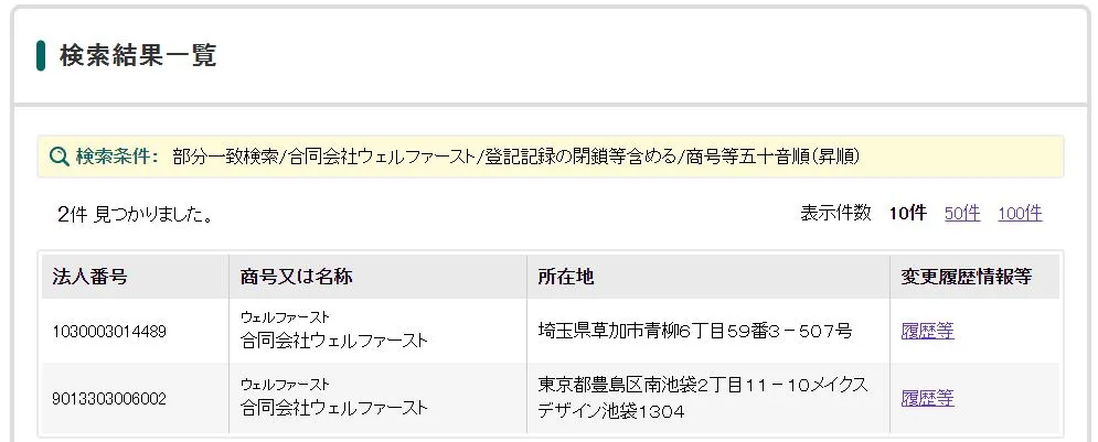 実在する会社なのか国税庁の法人番号公表サイトで調べると、該当する会社は全国で2つありました。