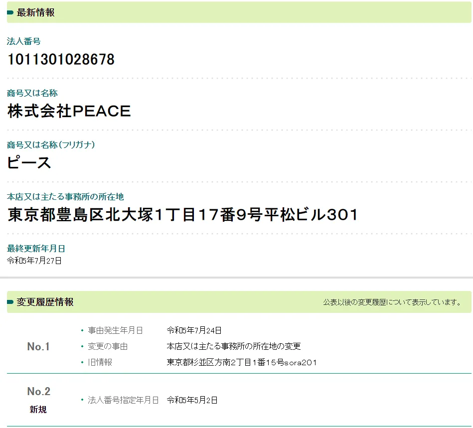 国税庁の法人番号公表サイトで株式会社PEACEの実在は確認できましたが、会社が登記されたのは2023年5月。