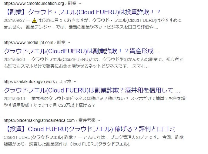 Cloud FUERU(クラウドフエル)の評判は「副業詐欺」や「投資詐欺」と評価するものばかり。