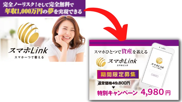 スマホLinkとは「完全ノーリスク!そして完全無料」で”年収1,000万円“の夢を実現できると謳う副業サイトです。