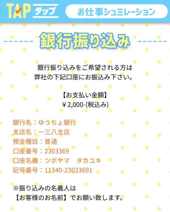 初期費用の支払い先は、代表者「坪山貴教」の個人口座になっていました。