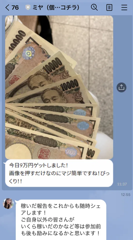 ミヤは案内の配信が一通り届いた後、先ほど紹介したTwitterで拾ったお金の画像を次々と送ってきました(笑)